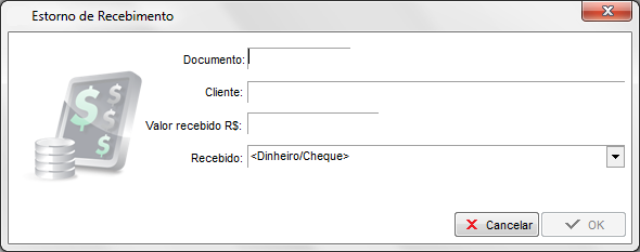 Informe o número do documento da conta a ser estornada, pressione Enter, confira os valores e selecione a forma de recebimento do valor estornado. Após confirmar clicando em OK a conta ficará pendente novamente.