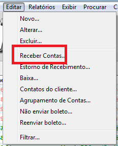 Também poderá efetuar o recebimento através do menu Editar > Receber Contas, sendo necessário informar manualmente o número do documento da conta.