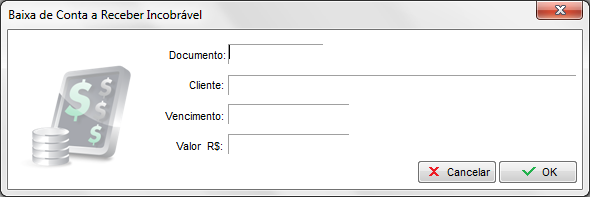 Podem existir situações onde a Conta a Receber possui vínculo com um documento fiscal e não será recebida, necessitando ser "Cancelada", nestes casos, a opção Baixa de Conta a Receber Incobrável é utilizada.