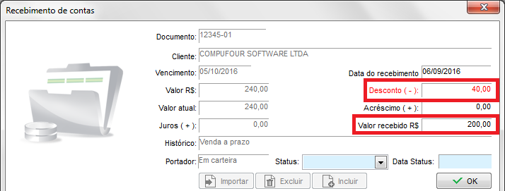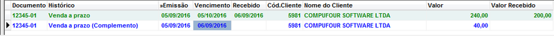 Clicando duas vezes sobre cada conta, na parte superior da tela será possível alterar seu valor recebido ou adicionar acréscimos e descontos (da mesma forma que alteram-se os dados de contas individuais).