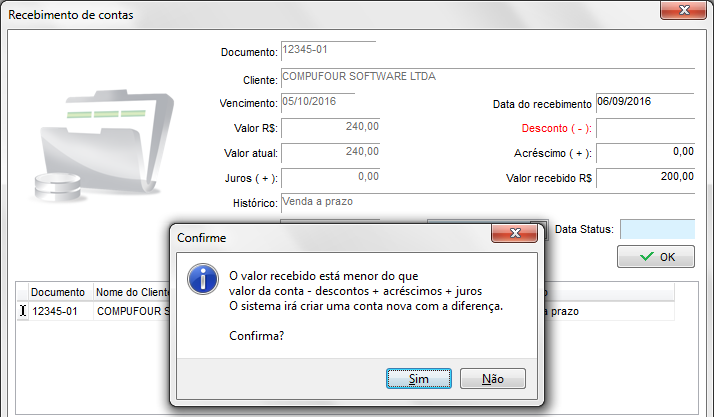 Ao reduzir este valor, o sistema irá gerar um Desconto. Para que seja gerada uma nova conta com o valor da diferença, basta apagar o valor do campo de Desconto ( - ) e deixar o valor recebido com um valor menor do que o valor total da conta.