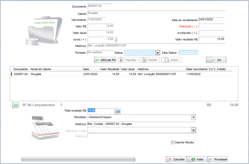 Na tela de Recebimento de contas, os dados serão preenchidos de forma automática de acordo a Conta a Receber selecionada: