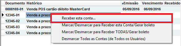 Para receber uma determinada conta de forma rápida, clique com o botão direto do mouse sobre a conta, e selecione a opção “Receber esta conta”: