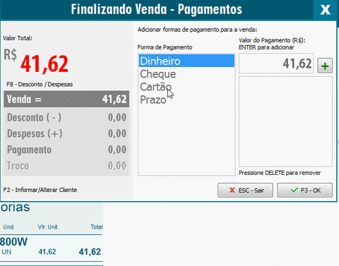 Neste momento, selecione a forma de pagamento desejada e logo a direita informe o valor do pagamento, em seguida pressione a tecla Enter, neste exemplo iremos utilizar a forma de pagamento Dinheiro.
