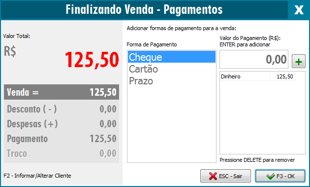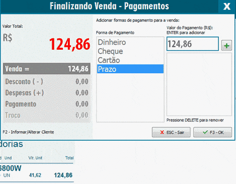 OBS: Digitando um valor maior que o total da nota no campo do Valor do Pagamento o sistema irá calcular o Troco: