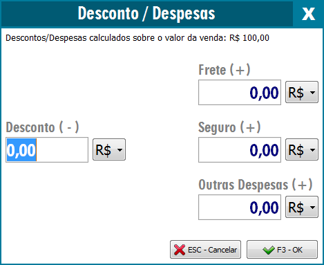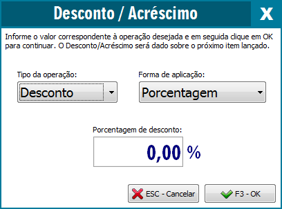 Para realizar o desconto no próximo item, antes de efetuar o lançamento do item basta pressionar a tecla F8 e informar o desconto em Percentual (%) ou em Valor (R$), conforme tela a seguir: