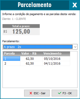 Após confirmar o nome do cliente, informe o parcelamento desejado conforme tela a seguir e em seguida pressione Enter para finalizar a venda.