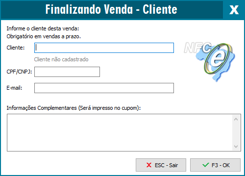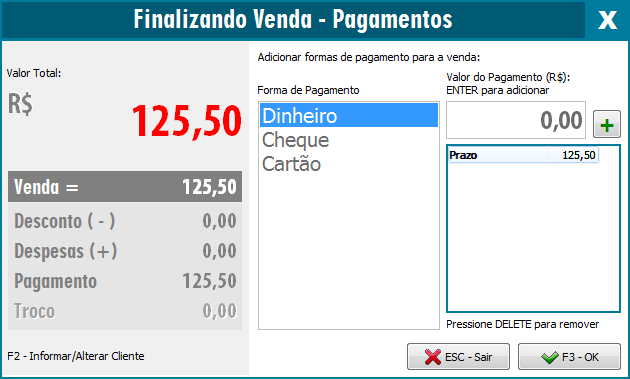 Após finalizar o lançamento dos itens basta pressionar a tecla F3, dessa forma podemos escolher a forma de pagamento.