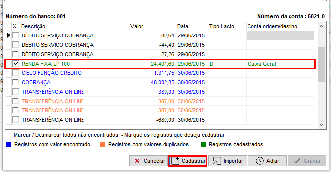 O registro na cor preta, representa um valor que consta no extrato mas não possui registro no sistema. Selecionando este valor, informando o "Tipo Lacto" (Tido de lançamento) e Conta origem/destino, é possível realizar um cadastro deste valor no sistema apenas clicando no botão Cadastrar, sem necessitar criar manualmente a conta para receber o mesmo.