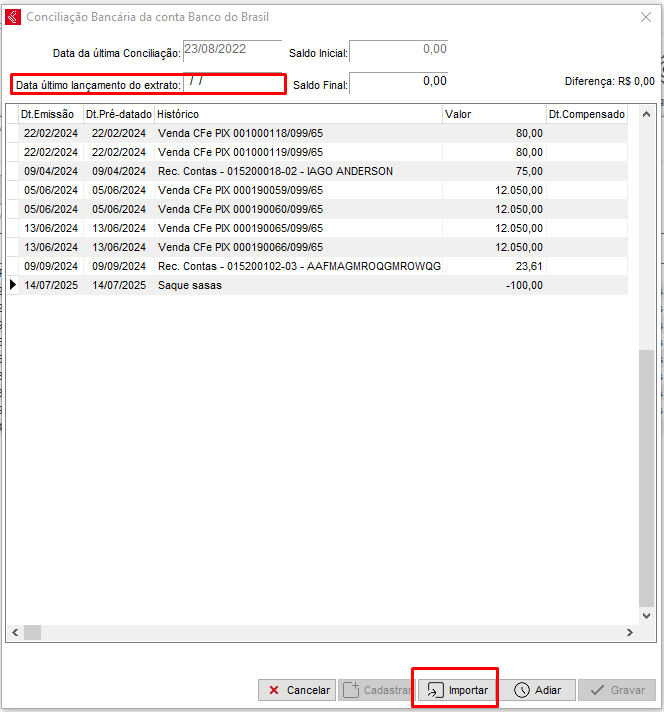 Informe a Data do último lançamento do extrato e clique em Importar: