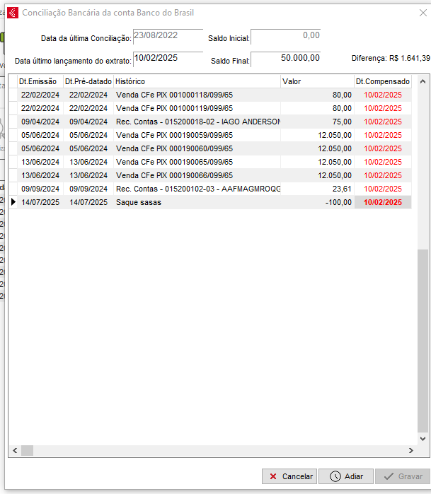 Na tela apresentada serão listados todos os movimentos ainda Não Compensados relacionados ao banco selecionado e o Saldo Inicial sempre irá trazer o valor que já foi conciliado.