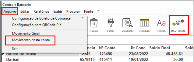 Para efetuar um novo lançamento, acesse o módulo de Bancos, clique sobre a conta desejada, em seguida acesse o menu Arquivo / Movimento desta conta, ou clique diretamente no botão "Movimentação Bancária".