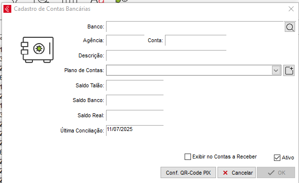 Contas bancárias que foram usadas em movimentações não podem ser excluídas, porém podem ficar inativas desmarcando a opção Ativo.