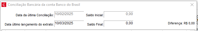 - Saldo do Banco: busca o saldo da última conciliação. Este será o saldo que de fato existe no banco após a conferência (conciliação) dos valores.