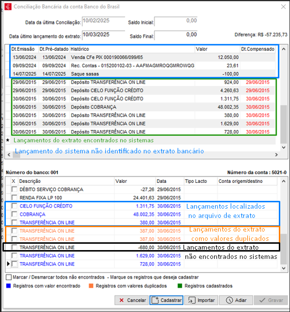 O sistema fará a leitura de todos os dados recebidos no extrato e uma comparação em relação aos dados lançados em sua conta bancária. Na parte superior da janela serão apresentados todos os lançamentos ainda não compensados da conta bancária. Na parte inferior, serão listados todos os lançamentos do extrato.