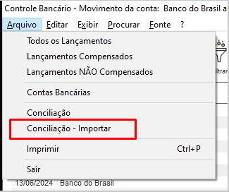 Com o arquivo já salvo em seu computador, acesse o Módulo de Bancos, selecione a Conta Bancária, clique em Arquivo > Movimento desta conta. Clique novamente em Arquivo e acesse a opção Conciliação – Importar: