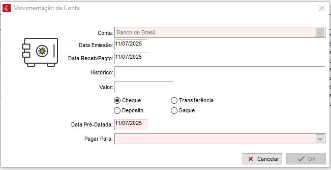 Data Pré-Datada: Caso informado o lançamento por CHEQUE, a data atual será adicionada, escolha no campo Pagar para, qual conta deseja lançar o valor.