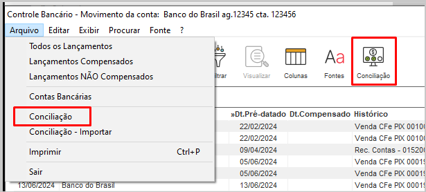 Em seguida acesse o Menu Arquivo > Conciliação ou clique sobre o botão "Conciliação Bancária”.