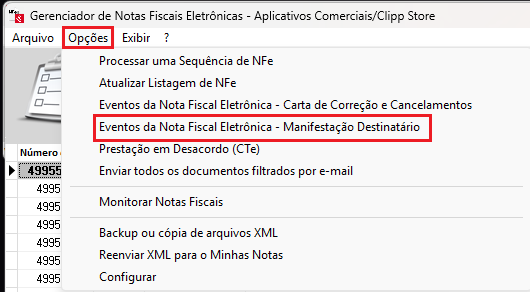 Para efetuar a manifestação, dentro do Gerenciador de Notas Fiscais Eletrônicas, vá até o menu Opções e clique em Eventos da Nota Fiscal Eletrônica – Manifestação do Destinatário.