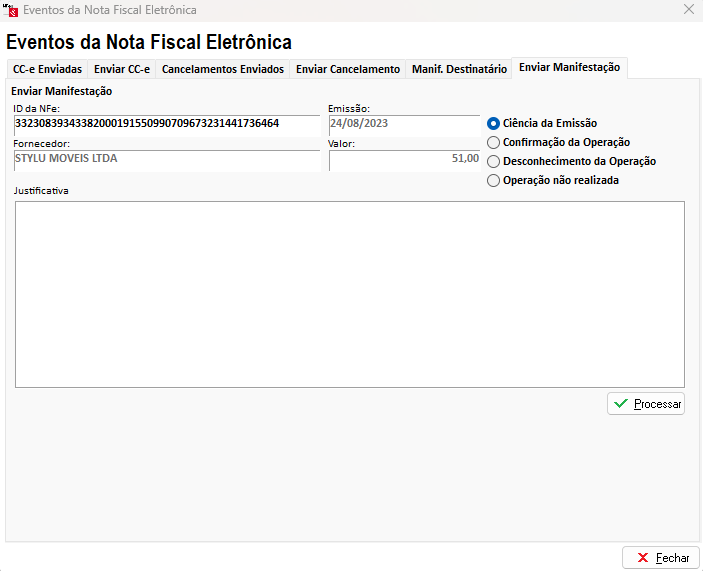 Feito isso, será necessário que informe a Secretaria da Fazenda se a empresa tem Ciência da Emissão, Confirmação da Operação, Desconhecimento da Operação ou Operação Não Realizada. Se caso selecionar a opção Operação Não Realizada, deve ser informada uma justificativa com no mínimo 15 caracteres.