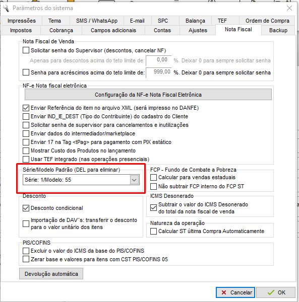 Ao acessar os Parâmetros do sistema. Localize a aba Nota Fiscal e selecione a Série/Modelo cadastrado recentemente como padrão.