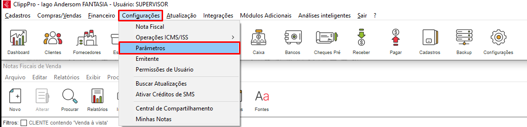 Após incluir a Série e o Modelo efetuado nos procedimentos acima, é necessário informar sendo esta configuração como padrão para a emissão da nota, para efetuar esse procedimento acesse o Clipp Pro. Clique em Configurações e acesse novamente os Parâmetros.