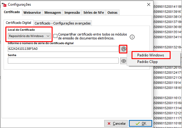 selecione a opção Padrão Windows para assim selecionar o certificado digital que a empresa utilizará para a emissão de Notas Fiscais Eletrônicas (é necessário que o certificado digital já esteja instalado no computador, lembrando que os modelos compatíveis são: A1 e A3).