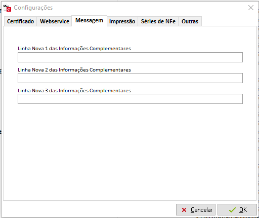 Nesta aba é possível configurar uma mensagem complementar para que a mesma seja impressa em todas as notas fiscais emitidas pela empresa. São três linhas disponíveis.
