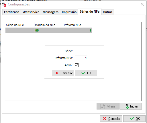 Nesta aba é possível inserir uma nova série para a emissão de NFe. Ao clicar em Incluir será necessário informar a série e número da próxima NFe a ser emitida: