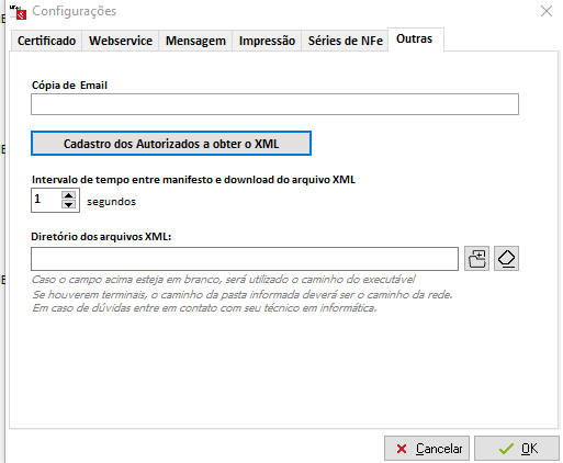 Na janela de configurações, serão apresentadas as abas: Certificado, Webservice, Mensagem, Impressão, Séries de NFe e Outras.