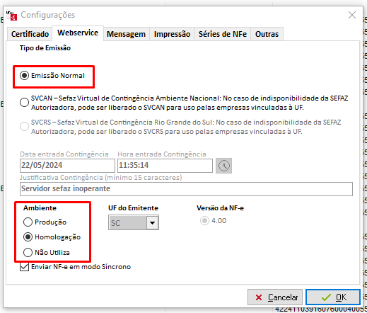 Em primeiro momento é utilizada a opção de Emissão Normal. Sendo necessário, será possível configurar a emissão de NFe em Contingência. Clique aqui para mais informações.