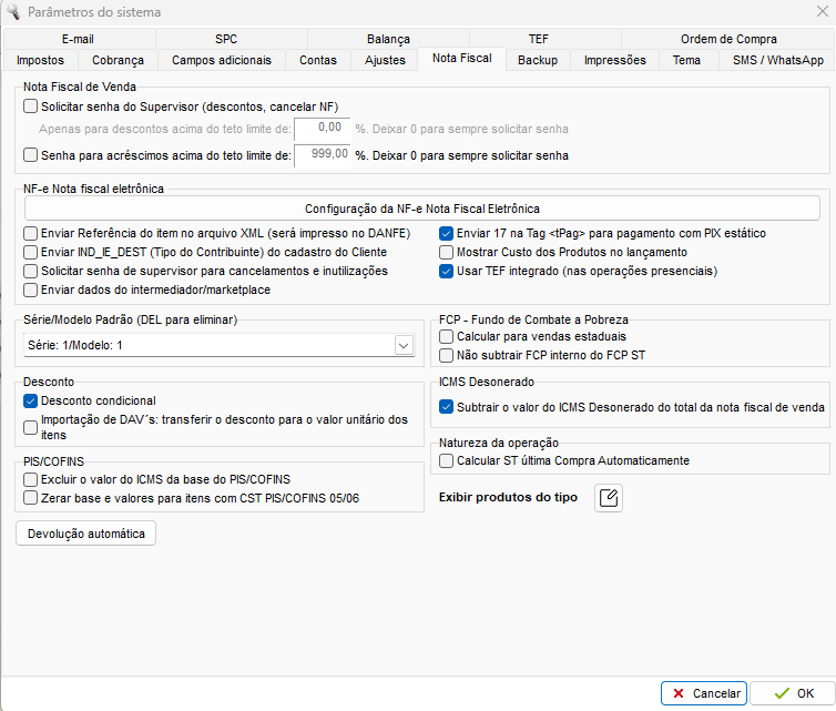 - Usar TEF integrado (nas operações presenciais): Habilita o cadastro da aba TEF para NFe nos parâmetros.