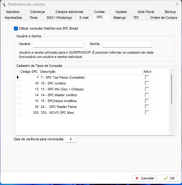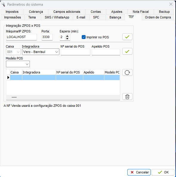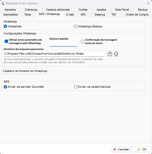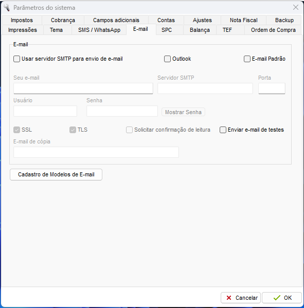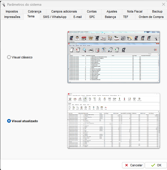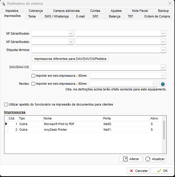 Impressões - Tema - SMS/WhatsApp - E-mail - SPC - Balança - TEF - Ordem de Compra