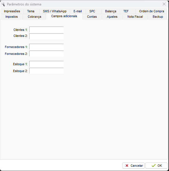 Esta opção possibilita a criação de mais dois campos para os módulos de Clientes, Fornecedores e Estoque. Ao digitar um nome para os campos, automaticamente os mesmos serão apresentados nos cadastros e poderão ser preenchidos com qualquer informação. Estes dois campos também irão aparecer nos relatórios ao exportar os cadastros.