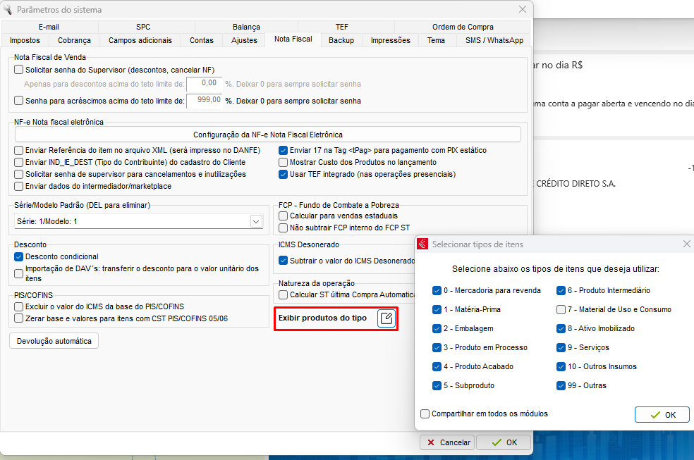 Também é possível ajustar qual tipo de produto deve e não deve aparecer nos módulos do sistema (compra/venda,etc..)