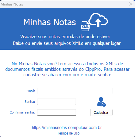 Quando o Minhas Notas estiver cadastrado com e-mail e senha, ele passa a salvar os XMLs do sistema ClippPro dentro da nuvem, e os mesmos XMLs podem ser acessados pelo site minhasnotas.Zucchetti.com.br