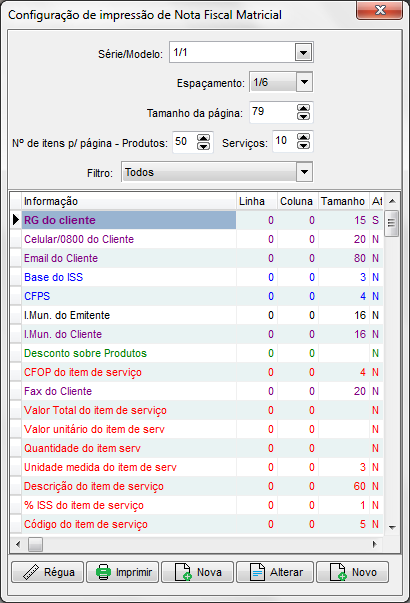 A régua não determina os limites de impressão. O limite das colunas é determinado pela impressora, já o limite das linhas pelo tamanho da nota. Para uma impressora de 80 colunas, como a LX 300, por exemplo, a configuração poderá chegar até a coluna 79 em caracteres normais e até a coluna 134 em caracteres comprimidos. Já as linhas dependem do tamanho da nota.