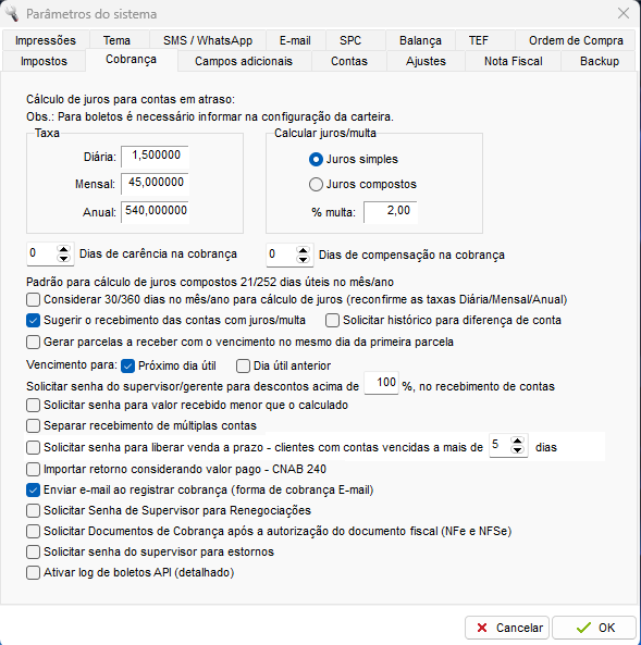 - Dias de carência na cobrança: Essa opção indica ao sistema a quantidade de dias que uma parcela em atraso não sofrerá acréscimo de juros.