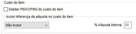 - Custo do item: É possível escolher se o PIS e COFINS serão debitados do custo do item, ao marcar, o sistema vai subtrair o valor do PIS e COFINS para formação do custo de compra do item.