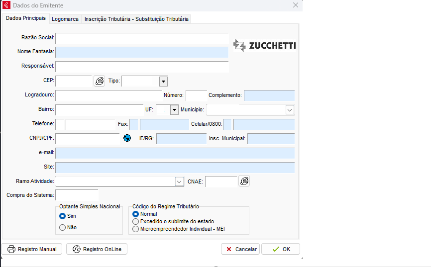 Esta opção permite cadastrar ou alterar os dados do emitente (empresa proprietária). Estes dados são usados nos títulos de relatórios, na emissão das notas fiscais, nos cálculos de ICMS, etc.