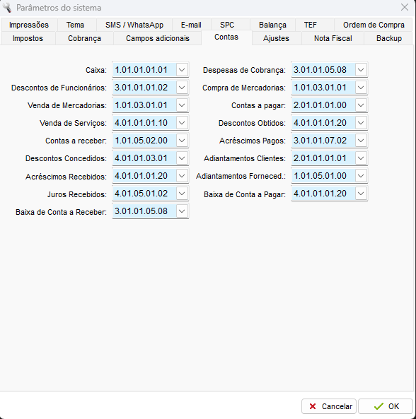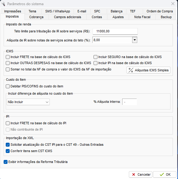 Impostos - Cobrança - Campos Adicionais - Contas - Ajustes - Nota Fiscal - Backup