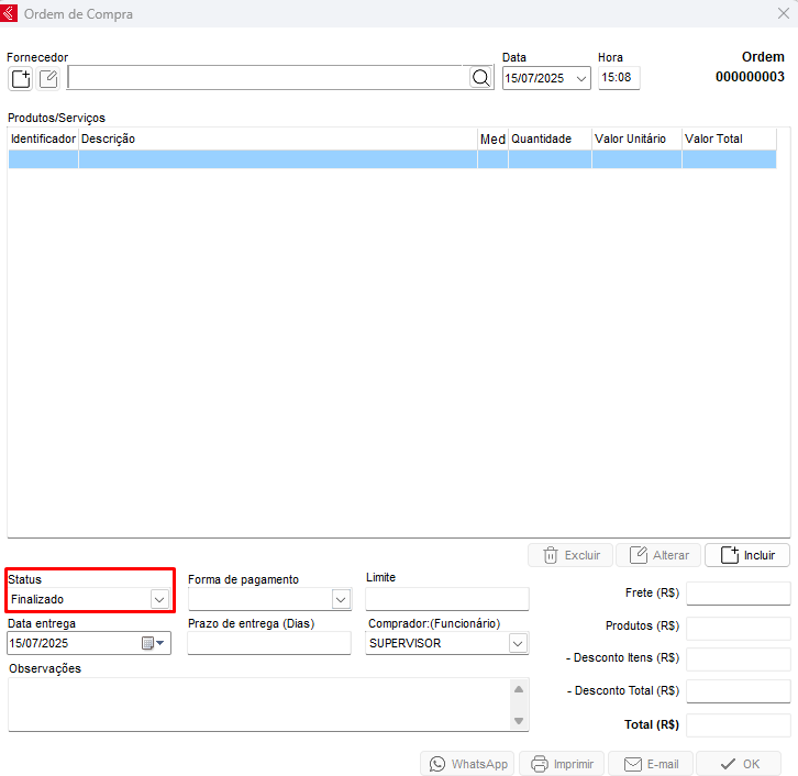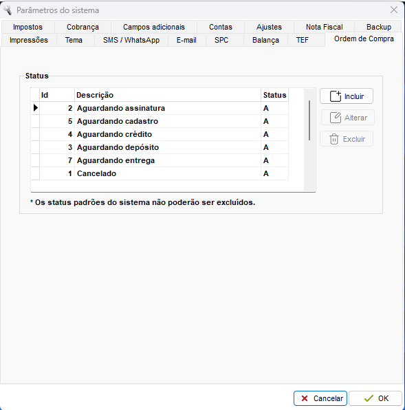 Onde é feito o cadastro de Status na Ordem de Compra, no módulo Compras/Vendas > Ordem de Compra
