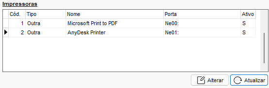 - Botão Atualizar: Ao clicar será atualizada a lista de impressoras com base nas impressoras instaladas no Windows.