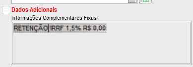 - Teto limite para tributação de IR sobre serviços (R$): Para empresas que possuem cálculo de IR sobre serviços, existe um limite mínimo para que este imposto seja destacado na nota fiscal. Podemos configurar esse limite através desta opção, caso adicione valores incorretos, apresentará o detalhe nas informações complementares fixas da nota:
