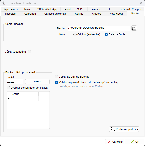 - Copiar ao sair do Sistema: Ao fechar o sistema, solicita se deseja realizar um backup.