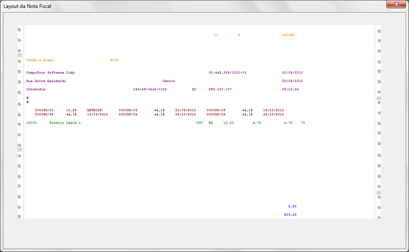 A nota fiscal pode ser configurada e no mesmo instante pode ser verificado como essa configuração ficará no formulário. Ao abrir Configurações / Nota Fiscal, o sistema apresenta duas telas. Na primeira é possível definir a posição de cada campo.