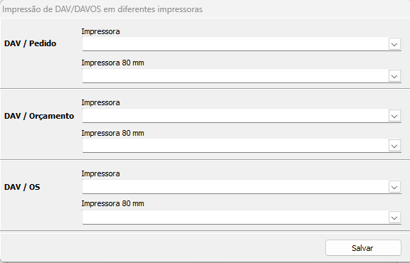 - Impressoras diferentes para DAV/DAVOS/Pedidos: Com essa opção você consegue determinar diferentes impressoras para cada tipo de documento: