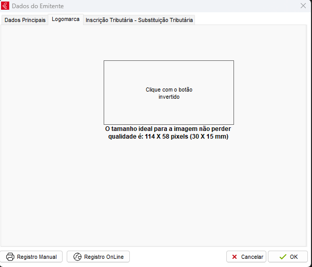 É possível utilizar a logomarca da empresa nos documentos fiscais e relatórios emitidos, para isso, clique com o botão direito do mouse no retângulo, em seguida clique em Procurar foto ou Capturar foto (webcam) para inserir a imagem. Lembrando que para imagem não perder qualidade sugerimos que o tamanho seja de 114 X 58 pixels (30 X 15 mm).
