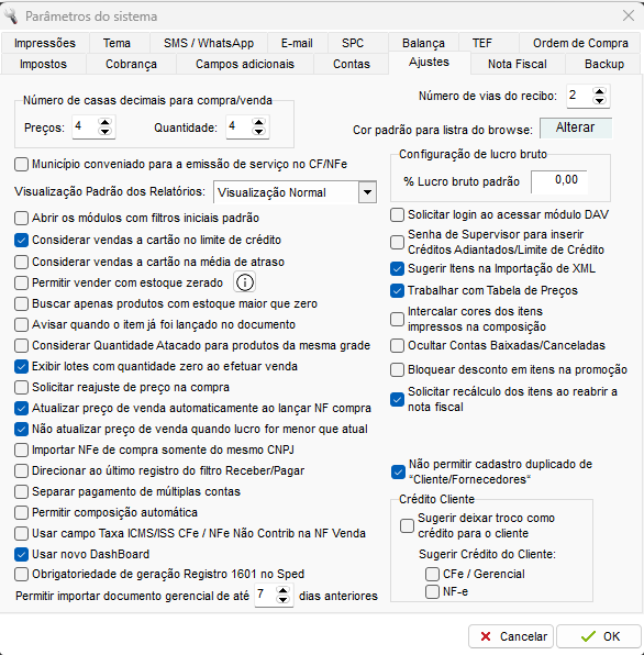 Na janela de Parâmetros do Sistema são apresentadas as abas:
