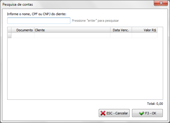 Neste local, é possível pesquisar pelo número do documento ou pressionar a tecla F2 para realizar a busca pelo Nome, CPF ou CNPJ do cliente.
